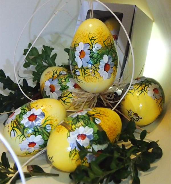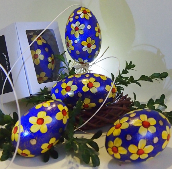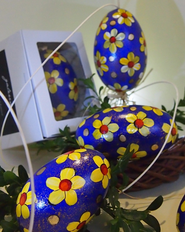 A to wersja ciemna pisanki na wydmuszce jaja gęsi. Pisanki są zawieszone na rafii i zapakowane w tekturowe pudełko z okienkiem. Wspaniały wielkanocny prezent. Zapraszam