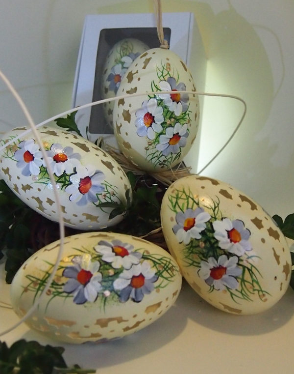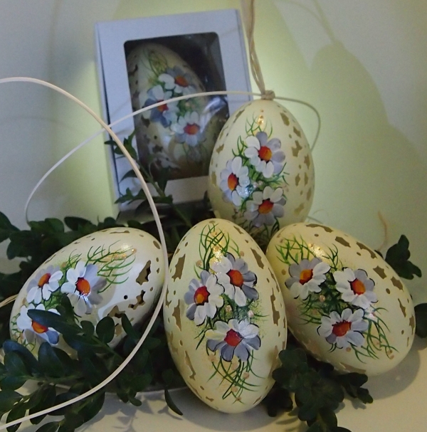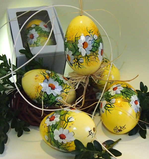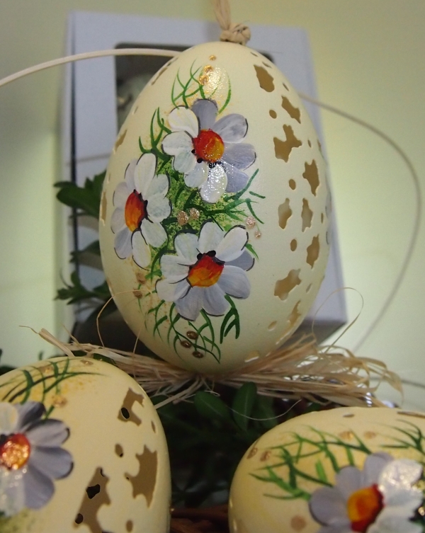 Pisanka wielkanocna ażurowa, wykonana na wydmuszce gęsiego jajka. Zawieszona na rafii. Wewnątrz posiada niewidoczną z daleka żyłkę. Zapakowana w kartonowe pudełko z okienkiem.