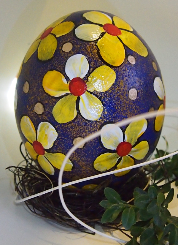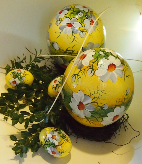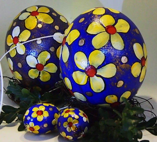 Ciemny wzór – na wydmuszce strusiego jaja. Pisanka na faszynowym wianku. Dla porównania wielkości, obok leżą pisanki namalowane na j=wydmuszkach z kurzych jajek.