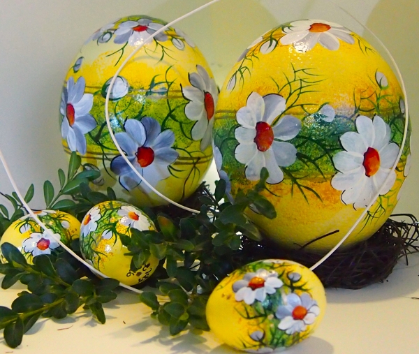 Rumianek - Jasny wzór pisanki wielkanocnej pełnej, namalowanej na wydmuszce jaja strusia. Pisanka postawiona jest na faszynowym wianku.